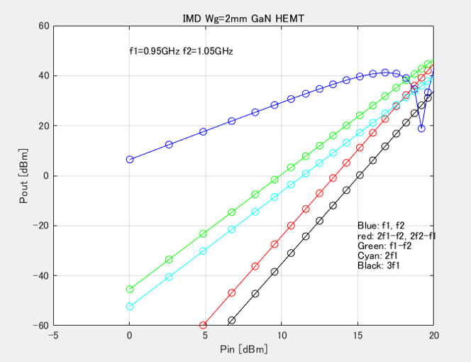 This load-line analysis software prepares two types of 2-tone analyses: 2-tone power series analysis for weak nonlinearity and 2-tone envelope analysis for strong nonlinearity [1]. For example, in the 3rd-order 2-tone power series analysis, 2-tone signal described in (11) and (12) is inserted into (9). Then the 2nd-degree term of (9) produces the 2nd-order product at 2w1, 2w2, w1+w2. The 3rd-degree term provides the 1st– and 3rd-order products at w1, w2, 3w1, 3w2, 2w1-w2, 2w2-w1. The 1st-, 2nd– and 3rd -order products are calculated and plotted as Pin-Pout in Figure 10. IIP3 can be easily obtained from the intersection point of an extended linear part of w1 and an extended linear part of w3.