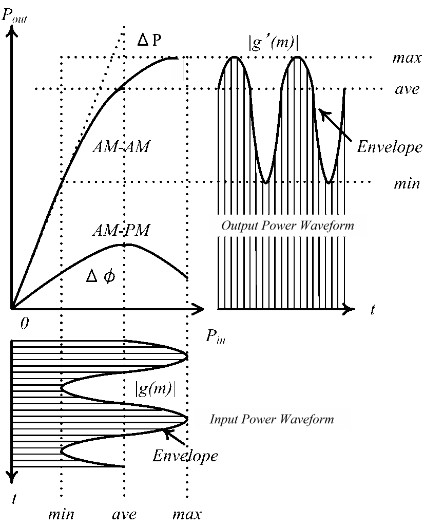 The 2-tone envelope analysis is shown in Figure 11 [1]. An envelope of the input 2-tone signal is modulated by a difference frequency of w1-w2 (w1> w2). The amplified output signal is distorted in both magnitude and phase through AM-AM and AM-PM performances of PAs, which produces a serious intermodulation distortion. Input and output signals are given by (13) and (14). The input time-domain signal g(m) can be transformed from the frequency-domain signal G(k) by the inverse Fourier transformation as (15). The input signal is amplified and then the time-domain output signal g’(m) is given by (16). Finally, the frequency-domain output signal G’(k) is transformed by Fourier transformation as (17).