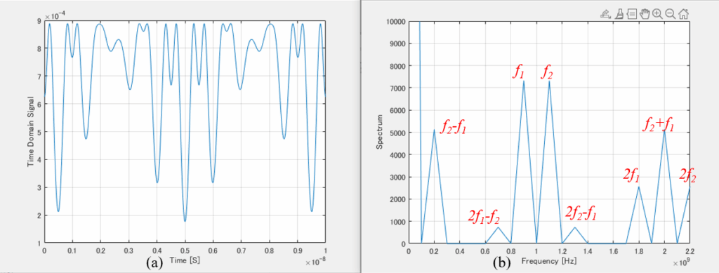 Time- and frequency-domain output signals are calculated with the use of 2-tone envelope analysis shown in Figure 11 and behavioral modeling of Figure 9 for 2-tone signal (f1=0.9GHz, f2=1.1GHz, v=0.02V) in (11) and (12), which are displayed in Figure 12. Figure 12(a) shows a time-domain output signal and Figure 12(b) displays a frequency-domain output signal (spectrum). IMD3 signals (2f1– f2 and 2f2– f1) appear adjacent to carrier signals (f1 and f2). In addition, a difference signal (f2– f1), a sum signal (f1+ f2), 2nd-harmonic signals (2f1 and 2f2) are also clearly shown. Due to the maximum limit of memory size of the computer, the resolution of spectrum becomes poor.