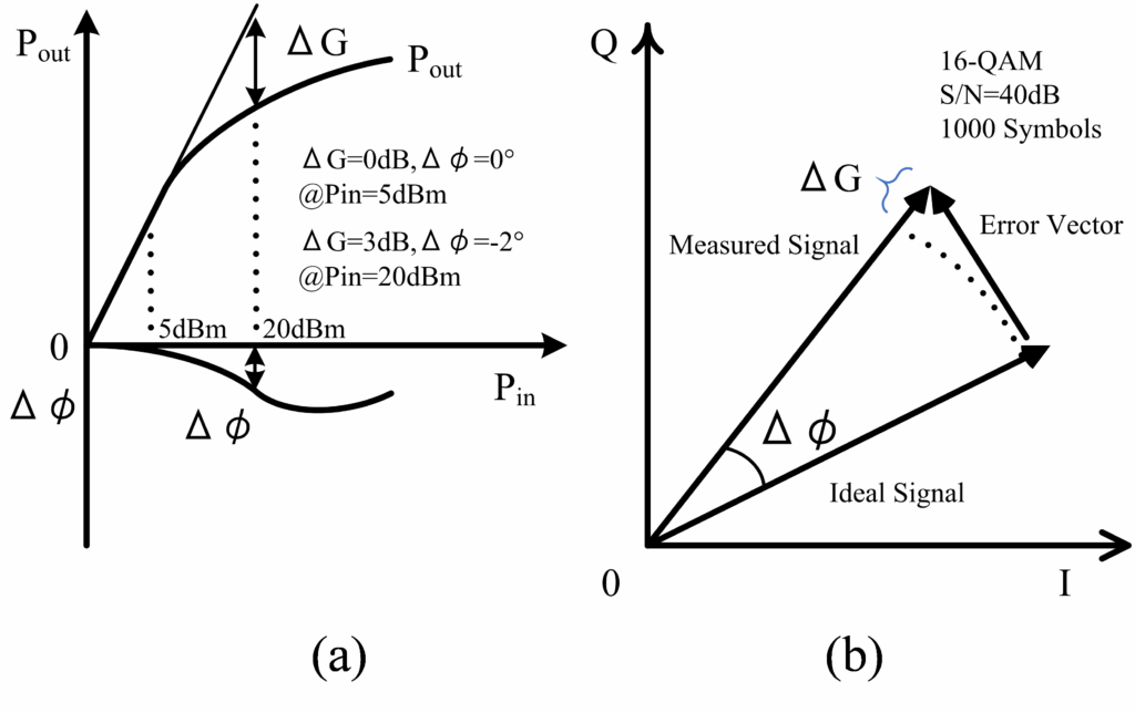 Error vector magnitude (EVM) evaluation can provide a great deal of insight into the performances of digital communications transmitters and receivers [14]. The error vector is defined as a vector difference at a given time between the ideal reference signal and the measured signal, which is shown in Figure 13. AM-AM performance having DG and AM-PM performance having Df in Figure 13(a) produce a serious vector error in Figure 13(b).