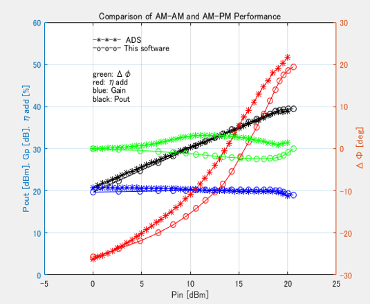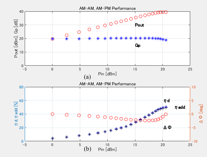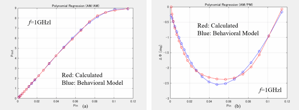 The calculated AM-AM and AM-PM performances shown in Figure 7 are also demonstrated in Figure 9 in conjunction with behavioral modeling. A good agreement has been achieved between the calculated and modeled data.