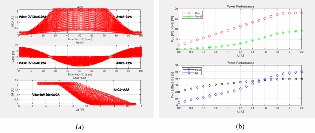 Id(t), Vd(t), a dynamic load-line are calculated by this load-line analysis software for GaN HEMT devices with Vk of 2V, Vbr of 100V, Vp of -2V and Idss of 2.14A, which is shown in Figure 2(a). As A(J) increases from 0.2 to 2.2A, Id(t) and Vd(t) also increase and the bias point moves upward from the initial point (10V, 0.214A) in conjunction with the load-line. The slope of -gl can be varied as a dynamic load-line but keep constant in this case. Output power (Pout), drain efficiency (hd), DC consumption power (Pdc) and Vd x Id can be calculated for a variation of A(J) and plotted in Figure 2(b). As A(J) increases, Pout goes up to 10W and hd also increases.