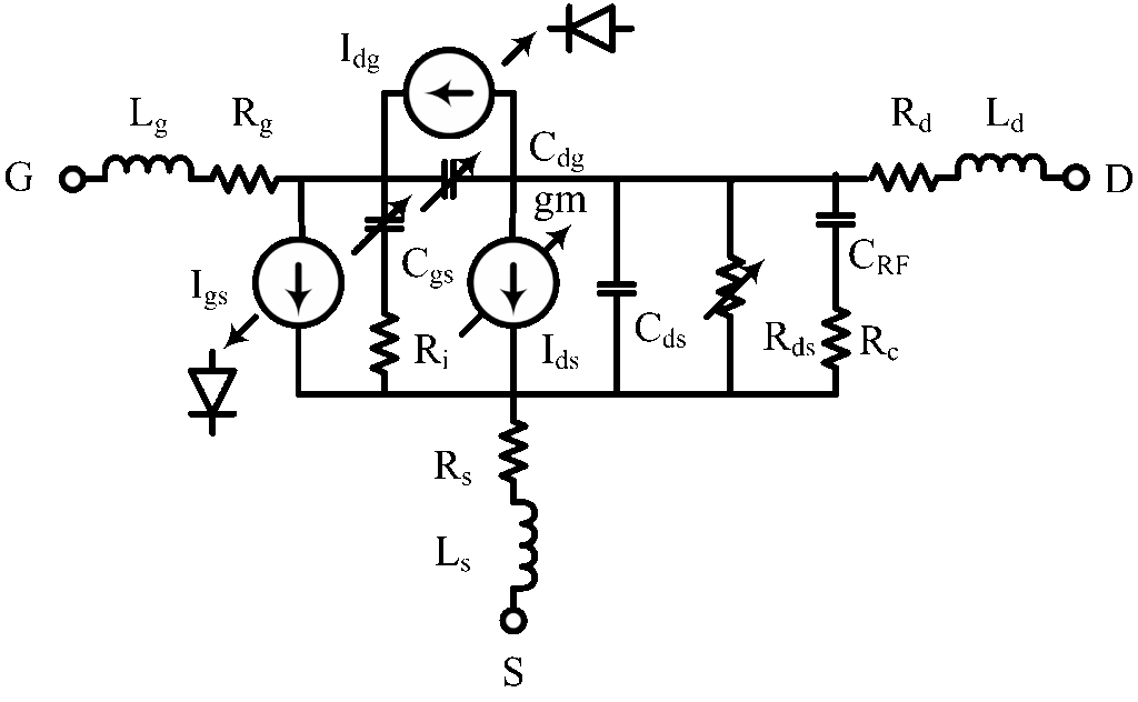 A large-signal GaN HEMT model is employed in the analysis, which is shown in Figure 3. Nonlinear circuit elements are transconductance (gm), drain-to-source resistance (Rds), gate-to-source capacitance (Cgs) and gate-to-drain capacitance (Cdg), which are obtained from I-V curves as a function of the gate voltage (Vg) and the drain voltage (Vd). A forward gate current (Igs) and a backward gate leakage current (Idg) are also included in the analysis for hard saturation and large leakage conditions. The nonlinear circuit elements (gm, Rds, Cgs, Cdg) and the gate current (Ids and Idg) are basically represented by behavioral modeling [11].