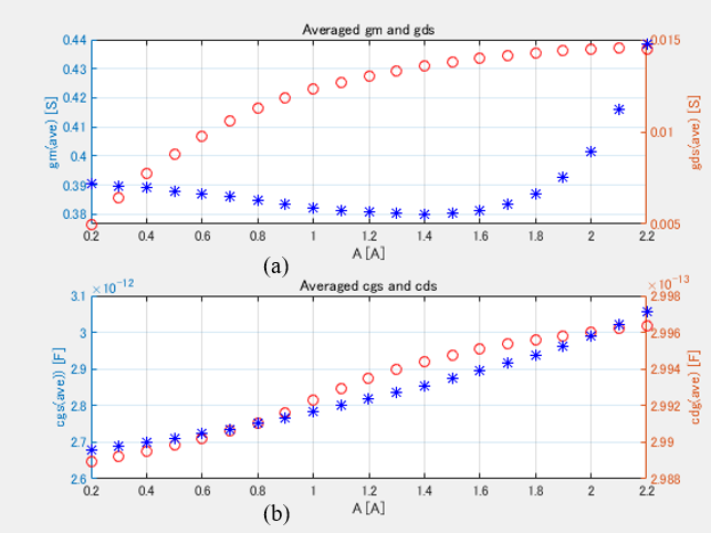 Cgs and Cdg defined by (5) and (6) also varies with A(J) on the load-line. Under large-signal operation, therefore, Cgs and Cdg are represented as an averaged value for one period, which are given as Cgsave and Cdgave by (7) and (8) [9-10]. In (5) and (6), Cgs and Cds utilize the Statz model [13].