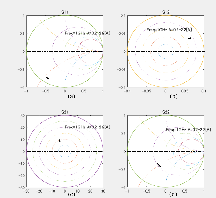 Since gmave, gdsave, Cgsave and Cdgave are obtained for each A(J), S-parameters of Figure 3 can be calculated, which is shown in Figure 6. A calculation was done for A(J) from 0.2 to 2.2A at 1GHz. Amid these parameters, S22 changes remarkably. A variation of Mag(S21) and Ang(S21) leads to AM-AM and AM-PM performances. In conjunction with the data in Figure 2(b), the output power (Pout), power gain (Gp), drain efficiency (hd), power-added efficiency (hadd) and insertion phase variation (Df) are calculated and plotted in Figure 7.