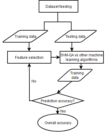 The input dataset is split into a training set and a testing set. This study uses 80% of each input dataset which is a commonly used ratio as the training set and the remaining 20% as the testing set. Since there are variables that do not contribute to the prediction accuracy of the model, and some even reduce the prediction accuracy, recursive feature elimination (RFE) [30] is used to remove such attributes while constructing prediction models. This process is captured in the step feature selection to the training data. The kernel functions of SVM formulated and solved by quantum annealing solvers are used in classifications.