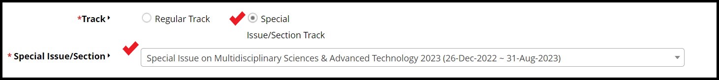 - During Online submission, you have to select Special Issue Paper from Track menu and then select Special Issue on Multidisciplinary Sciences and Advanced Technology in Special Issue/Selection. (Screenshot attached below)