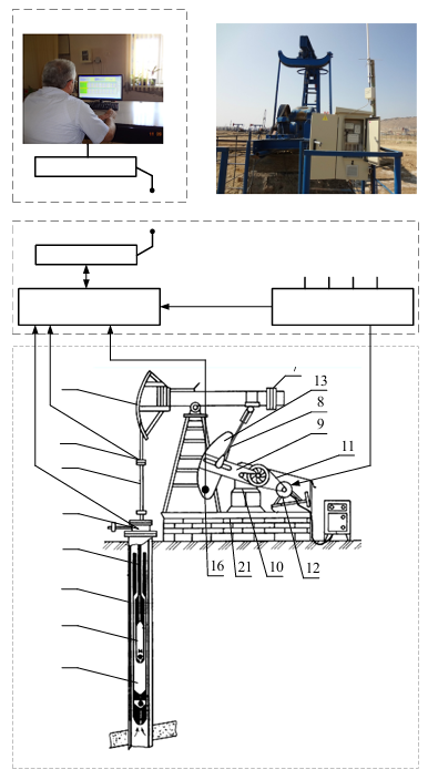 - The level of the control station, consisting of a SPRU controller according to a dynamogram for collecting information from force sensors “14”, wellhead pressure “15” and rotation angle “16”; a frequency converter for controlling the speed of the electric motor; a radio modem with an antenna for information exchange of the SRPU control system with a centralized control center using the MODBUS-RTU protocol.
