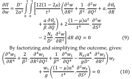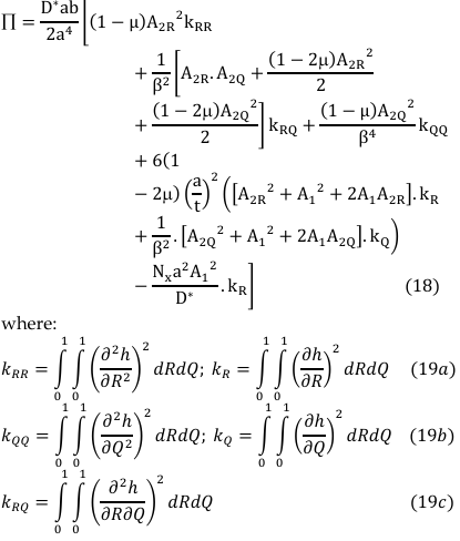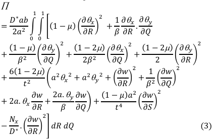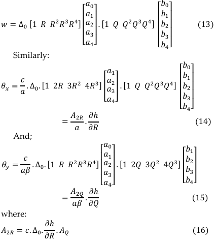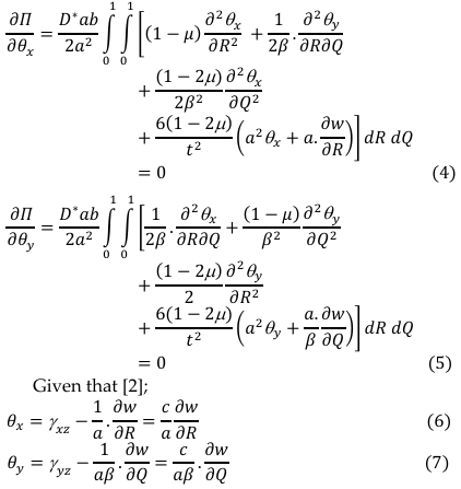 By differentiation of total potential energy with respect to 𝜃x and 𝜃y and establish the relation between the rotation and deflection [8] gives: