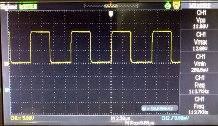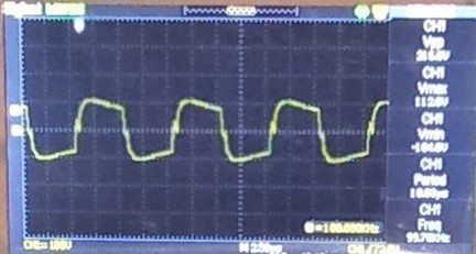 Thirdly, DC power supply inductor was posing the problem, so it was removed as it was main reason behind large ’off-time’ of IGBT. The waveform in the following Figure 8 showing the response of IGBT at high voltage and frequency.