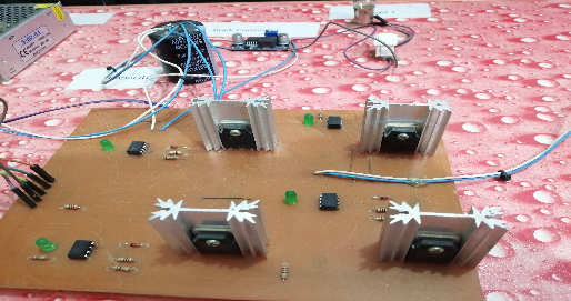 Variable AC input was fed to the high voltage rectifier. Then rectified pulsating DC was smoothed by using 2200UF, 400V capacitor. Hence re- quired 400V and 15A DC was fed to the inverter [3]. The following figure is showing the high voltage DC supply on the same PCB board contain the high voltage rectifier and 2200uF, 400V rating capacitor.