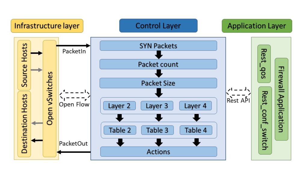 To stablish the connection between infrastructure layer and control layer, we used OpenFlow protocol as a southbound API. We designed and developed a firewall application with multiple stages of filtering technique and applied this in SDN controller to filter the packets. By using this application, when Open vSwitch receives the packets from the source hosts, it will add the flow to the flow table on layer-based header entities and send the PacketIn message to the controller. The controller and switch perform three-way handshake by synchronizing the packets to stablish the connection between them. After