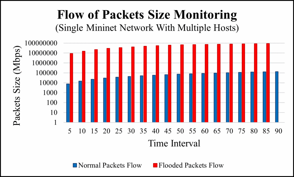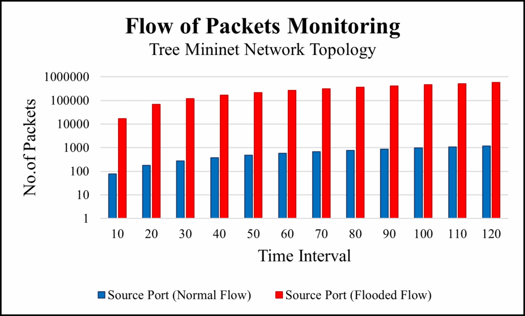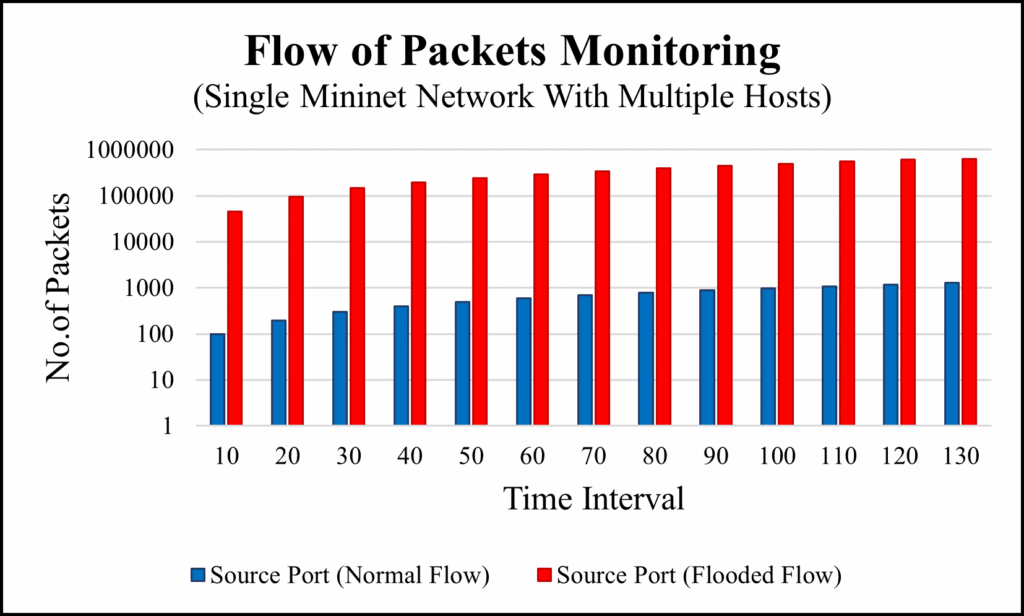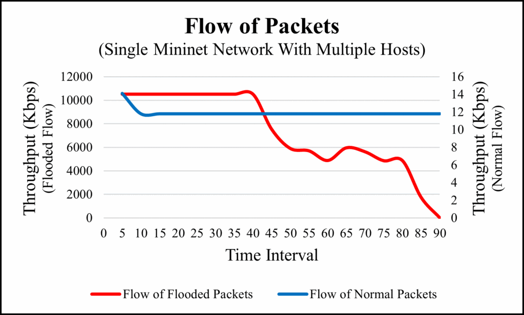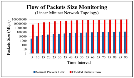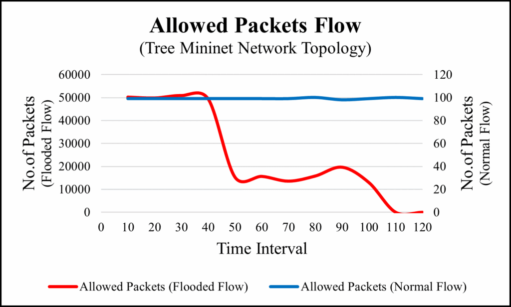 As shown in Figure 7 that OFPFlowStatsRequest are the flows between controller and switches. We accessed the size of packets flows by monitoring OFPFlowStatsRequest and saved as an CSV file in every 10 seconds. Similarly, to measure the flow of packets, we used the data of OFPPortStatsReply. We measured the flow of PortStatsReply that are directly connected to the attackers hosts and the victim hosts and compare with them to get the dropped packets. Moreover, we calculated the flow of increased packets and the packets that are permitted to enter the network as allowed packets.
