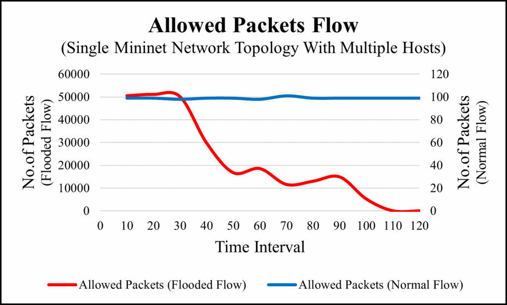 the flow of packets before the filtration and Figure 15 shows the allowed packets flow passes by the controller. As we can see in Figure 15 that allowed packet of normal flow remain constant in every time interval. But flooded flows have the dropped packets therefore, the allowed packets decreased and end up with 0 at the end.