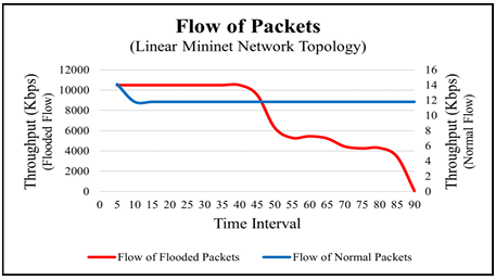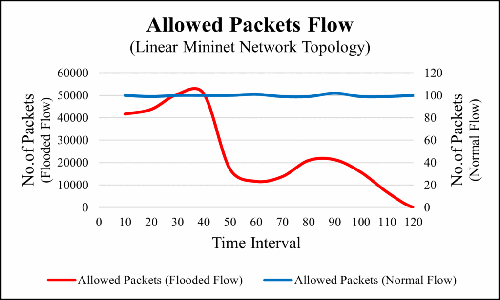To conduct this experiment, we used the network architecture of linear topology. To generate the traffic, we used h1 as an attacker and h10 as a victim host. We evaluated the system by collecting all the flowing data based on the controller’s response to the traffic flows. To collect the data, we monitored both ingress and egress ports of source and destination. Based on those two different flows, we collected the data of dropped packets, and allowed packets etc.