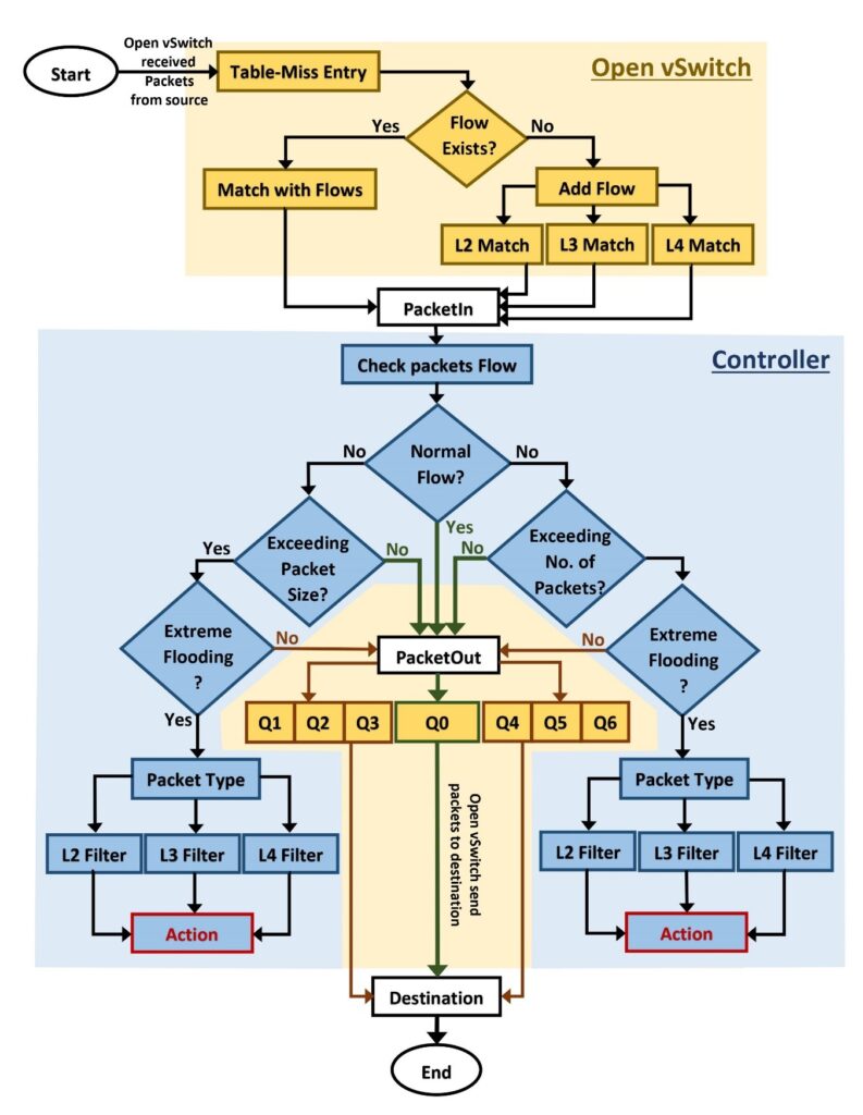 We designed a network scenario of packets flow as shown in Figure 2. When the source generates the traffic and send them to the destination, the traffic passes through different Open vSwitches (depends on mininet network architecture) and controller with being monitored by the system on different stages. Mainly, we categorized the flow of packets into two parts, one is the flow of traffic in Open vSwitch (OVS) and the other is traffic in controller. The OVS stores the details of flows on layer-based packets header entities when it receives the traffic from source, and when filtration completes, it forwards the selected traffic to the destination. And controller monitors the traffic flow to control over them based on their flow size.