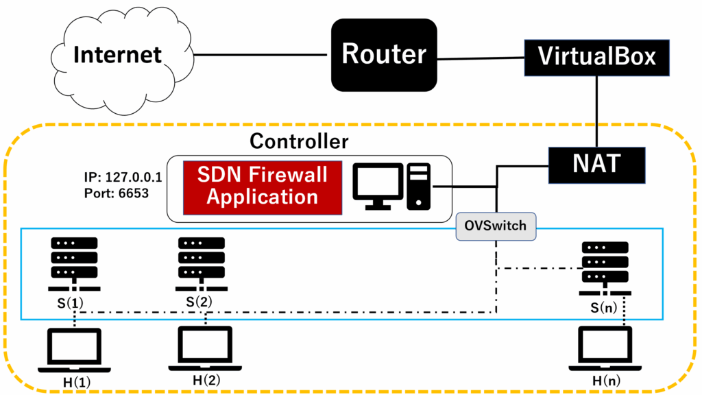 To conduct experiments, we created the laboratory as like Figure 3. We installed the virtual machine (Ubuntu 20.04) in the VirtualBox, and created the experimental scenario by installing mininet emulator on this machine.