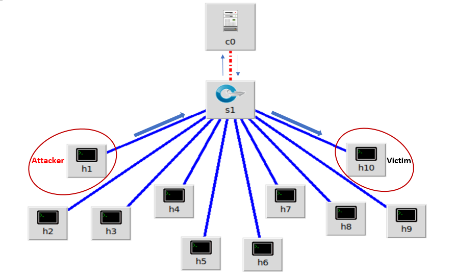 Figure 4 shows that the single mininet network topology which has single switch and multiple hosts connected to the OpenvSwitch. To create this network topology, we used one switch with ten mininet hosts (h1 to h10). All hosts are connected directly to the switch (s1) and the switch is connected with the Ryu controller remotely. In this network topology, h1 is used as an attacker and h10 is used as a victim machine. The flowing packets from attacker to the victim will flow through the switch s1.