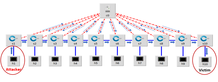 To create linear mininet network topology, we used ten switches and ten hosts connected in a linear way as we can see in Figure 5. All switches are directly connected to the remote controller (c0) to get the instruction from controller. To conduct an experiment on linear mininet network topology, h1 is used as an attacker and h10 is used as a victim. When h1 sends packets to the victim, the packets pass through all the switches that exists in between source and destination. In our case, we used first host as sender and last host as the receiver, therefore the flooded packets will bypass all the existing switches in our designed system.