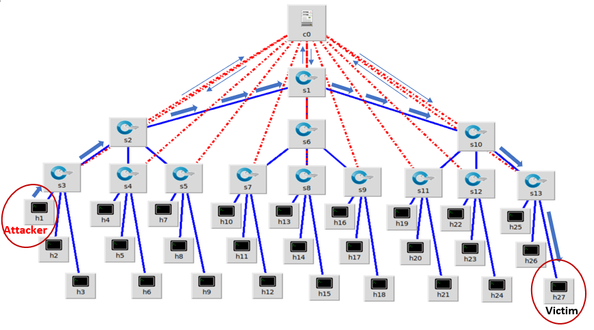 To create tree mininet network topology, we used three depth and three fanout as we can see in Figure 6. We created Open vSwitch from s1 to s13 and hosts from h1 to h27. In tree topology of SDN network, three depth means that the switches have three layers with the same number of fanouts. And, fanout means the number of children on each switch. In our tree network topology, s1 have three child switches (s2, s6 and s10) and further child switches have three more child switches, and all three child switches are connected with their parent switch. To conduct an experiment on this network topology, we used host s1 as an attacker host and s27 used as a victim host. As like the previous network scenarios, the flooded packets flow through the switches in between source and destination by identifying the best path to reach to the destination. In tree network topology, it forwards the packet flows to their parent switch by using the best path and reach to the targeted hosts.