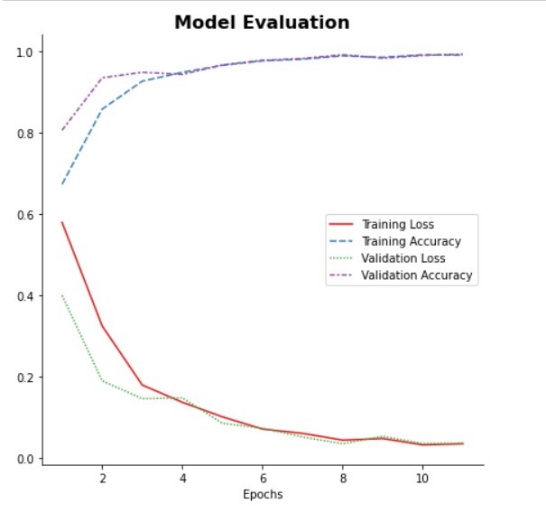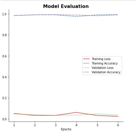 In CNN_Model_3, the output of CNN_Model_2 is utilised to retrain as a learning process for the training model to get better results for precision. Table 3 of the classification report, CNN_Model_3, gives an accuracy of 98.60% with a precision of 96.32%, which seems promising. However, the model evaluation of CNN_Model_3 in figure 10 shows that model had just started to get better, which has stopped just after epochs 6. It can be confirmed by observing that the validation loss and training losses match each other from the start, and the validation accuracy also matches the training accuracy, as shown in figure 10.