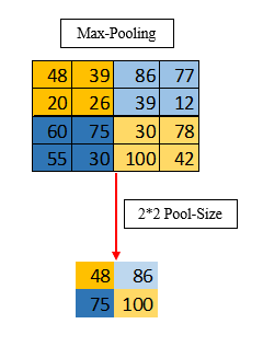 The pooling layer is usually sandwiched between two convolutional layers and receives many feature maps as input before performing the pooling function. As a result, the pooling method minimises the size of images while preserving their essential characteristics. As a result, the pooling layer reduces the number of parameters and calculations in the network, improving performance and preventing overfitting [3]. A convolutional network includes local or global pooling layers, which combine the output of neuron clusters at one layer into a single neuron in the next layer. Pooling has no learnable parameters. It only minimises the size of the images, preserving their essential characteristics. The proposed model architecture is built using the max-polling function. For example, a window of 2 and stride of 2 take the maximum value of the window and save it in the pooling layer for further work, as shown in figure 3.