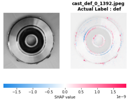 Figure 5 shows how the model interprets the images captured by the system. The left image in figure 4 shows the defective product, and the right image shows the illustrated view of how the model interprets the images for evaluating the defective or non-defective product. The colour red represents that the model is confident over the defective region, blue represents the non-defective region, and the non-colour region is confident the region is perfect. The model evaluates the input images and gets the confidence level to predict the product as defective or non-defective.
