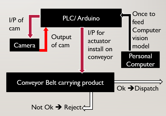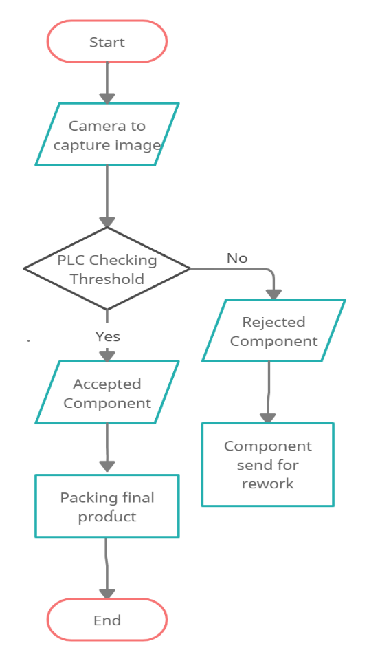 The machine vision’s significant role in the inspection starts after completing all the machining processes when the batch of components is sent for packing purposes. Simultaneously, the component goes along a conveyor, and the camera captures an image and transmits it as an input to the PLC, which compares it to a threshold. Thus, PLC first processes the image to decide the acceptance and rejection of the components based on the threshold set by the model architecture installed into the PLC. If the accuracy of the component is above the acceptance threshold, the component is sent for packing purposes. However, the component accuracy is below the acceptance threshold, and the component is rejected and sent for rework. For rejecting a component, the PLC sends a command to the Actuator to remove the rejected component. This complete process moves in the if loop, as shown in figure 7.