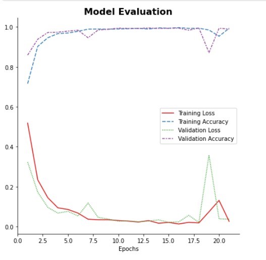 In CNN_Model_2, the output of CNN_Model_1 is utilised to retrain CNN_Model_2 as a learning process for training the model to reduce the overfitting of the model. Table 3 of the classification report, CNN_Model_2, gives an accuracy of 98.46% with a precision of 95.97%, which seems promising. However, the model evaluation of CNN_Model_2 in figure 9 shows that model had stopped overfitting and stopped earlier at epochs 17, as at epoch 17, overfitting was started in the previous model. It can be confirmed by observing that the validation loss and training losses match each other after epoch 6, and the validation accuracy also matches the training accuracy, as shown in figure 9.