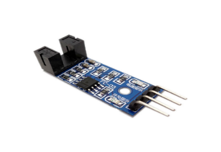 Four pins make up a speed sensor (ground, 5 volts, analog, digital). The speed sensor has two black columns, as seen in Fig. 4. One of them is the photo diode, whose job is to send a signal to a similar column. Two LEDs make up the speed sensor. If the first LED illuminates, it shows that there is power; if it does not, it indicates that there is no power; and if the second LED illuminates, it indicates that the signal has arrived; if it does not, it means that the signal has not come. A black box, which is an amplifier that converts from digital to analog, is also included.