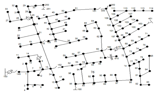 Table 1 illustrates the location and status of all the switches in the IEEE-123 Node Test Feeder System. From Figure 1 and Table I, it can be deduced that only six switches (Switch 1 – Switch 6) can modify the network structure. From the switches utilised, three loops namely L1, L2 and L3 can be obtained. L1 is arises from the closure of switches Switch 1, Switch 2, Switch 3, Switch 4 and Switch 5 whereas L2 is formed by closing Switch 1, Switch 2, Switch 4, Switch 5 and Switch 6. Meanwhile, L3 results from the opening of all the switches except Switch 3 and Switch 6. To maintain a radial network structure, one switch must be in the open state in each loop. Radial configuration is important for the proper management and protection of the system. 1. From the 64 possible switch combinations, only the 48 combinations which generated a radial network structure were used in the simulation [23].
