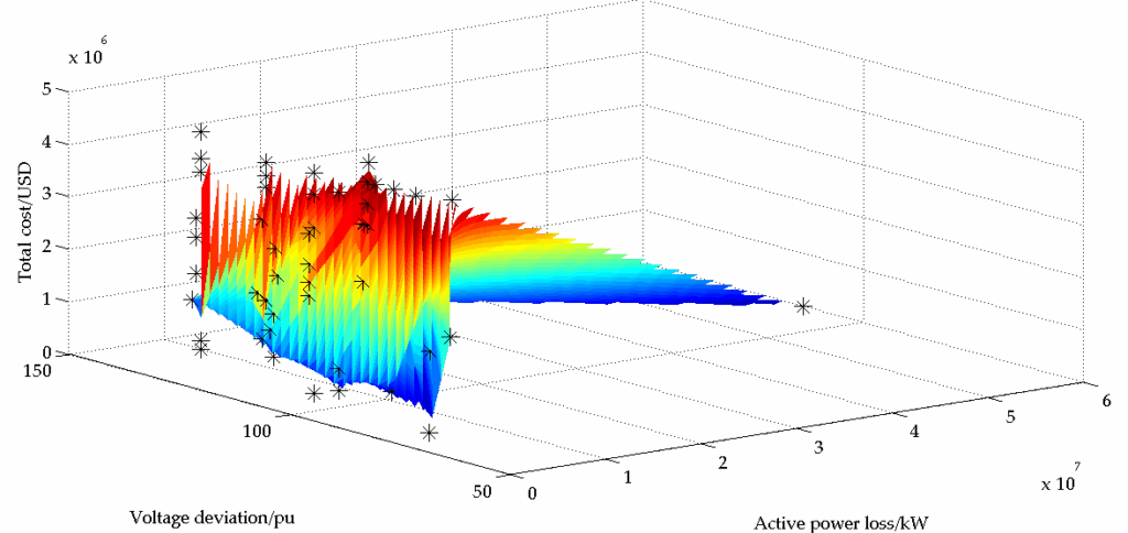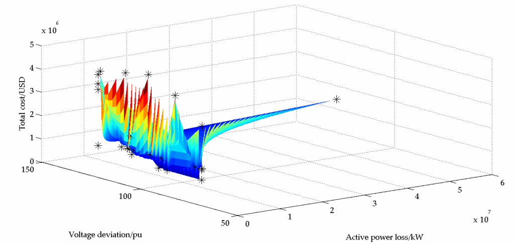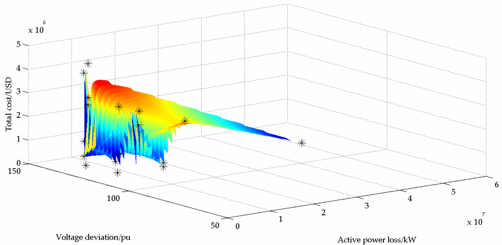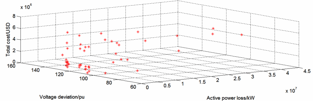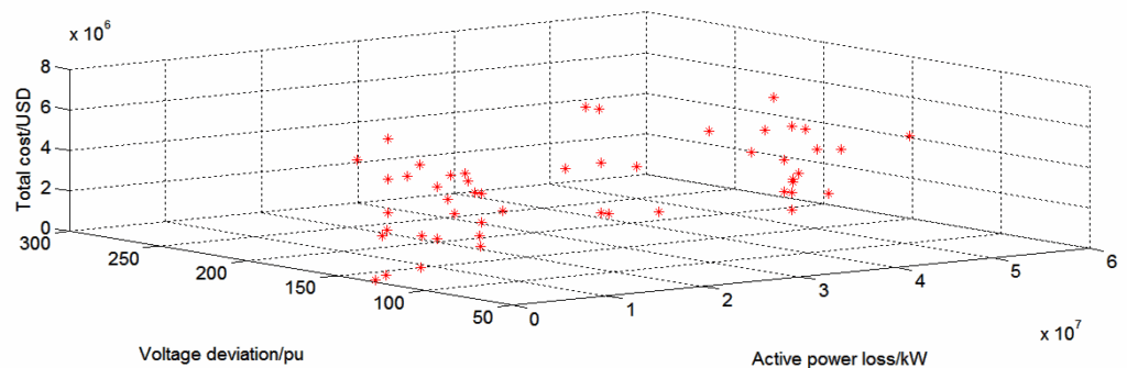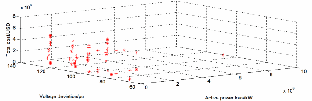 Figure 11 to Figure 13 shows the three-dimensional surface plot superimposed on the scatter plot generated by SPEA2-MOPSO, NSGAII-MOPSO and MOEA/D-MOPSO respectively. The figures illustrate the compromise among the three objective functions. There is no solution which generates the best value for all the three objective functions. It is up to the engineers to choose the solution depending on the needs of the power system at that time.