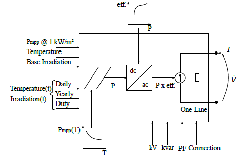 The PV system contains semiconductor materials which convert solar energy to electrical energy. Figure 2 illustrates the PV system model. The active power output in the connection node at time t is obtained by multiplying the PV array output P(t)and the inverter efficiency as shown by (5).