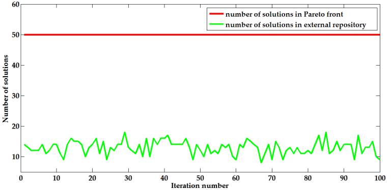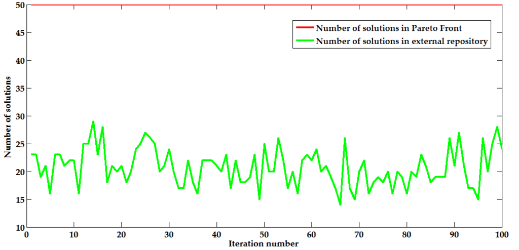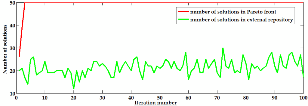 Figures 5 to 7 show the number of non-dominated solutions stored in the external repository used by the MOPSO section in the NSGAII-MOPSO, MOEA/D-MOPSO and SPEA2-MOPSO respectively. It was found that the repository was never full after the application of MOPSO. In NSGAII-MOPSO, the maximum number of non-dominated solutions identified in the lower portion of the population was 18 at iteration number 29 and 85. It amounts to 30 in MOEA/D-MOPSO and occurred at iteration number 72. For SPEA2-MOPSO, the number of non-dominated solutions in the repository reached a peak of 29 at iteration 14.