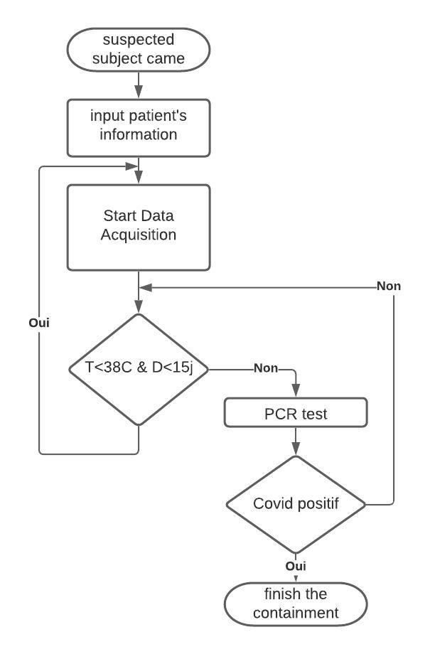 For the medical data processing there are three main phases, firstly data acquisition, in which we take the needed data but with all the measurements noises and artifacts, fortunately for temperature there is no possible artifacts if we measure from the proper region. Secondly data cleaning or denoising in order to remove all the artifact and keep only the useful part of the signal and the precision of this stage will significantly affect the quality of the next step. Thirdly data classification in this phase we check if the medical parameter is in the normal range or not. our focus in this section the human body temperature. The normal value of this last is 36.66, but this value is changing by the time [7] have performed one important study after several years they discovered that the average human body temperature is 36.11°C and not 36.66°C [7]. According to the CDC (centers for disease control and prevention) a person is considered has a fever when his/her temperature is greater than 38°C. so our platform calculation is taking 38°C as a threshold value. If the suspect case get a high temperature. The covid test must be performed immediately in order to confirm his infection.