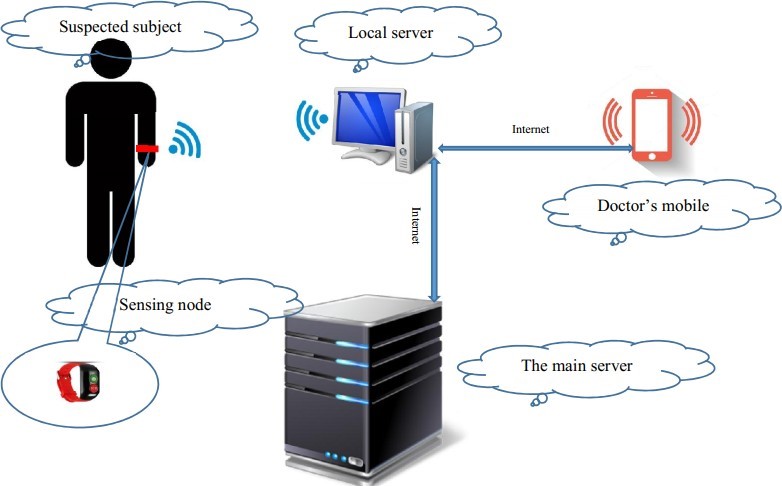 - The local server is the computer located in each hospital; it is responsible for the real-time analysis of all the acquired medical parameters. It detects the high temperature, the patient’s location if there are any changes. At the end of each period of time determined by the user will send all data and statistics to the main server. The doctor’s phone also will be notified from that local PC.
