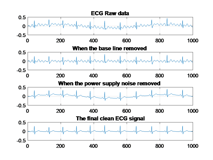 - The signal cleaning: in this stage, we have to remove all the noises and keeping only the useful part of the signal. There are two kinds of noises, the first one is related to the patient like the breathing, the baseline, the interference of the other physiological signals like the EMG, etc. the second type of noise is related to the patient itself. Such as the white noise, the power supply frequency, to remove all kinds of noises there are several methods, the classical filter like the high pass filter, the band pass filter and so on but also there is the wavelet method and the blind separation method. The most important thing is to remove only the noise components and keeping the desired part of the signal. We focus on that purpose because some filtering methods may destroy the useful part of the signal. The figures below illustrate different cleaning operations that were performed during this work during the cleaning process three kinds of filters were used, the notch filter to remove the power supply frequency, the “Detrend” function of MATLAB to delete the linear part of the baseline and the polynomial interpolation to remove the nonlinear component of the baseline[12].