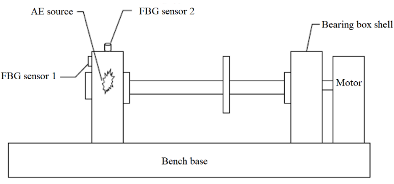 Nine simulated pitting faults were evenly distributed by Empirical Mode Decomposition (EMD) on the outer ring of the rolling bearing. The load condition was 5kN, and the speed conditions were 600r/min and 1200r/min. When the bearing is running, the acoustic emission signal emitted by the collision between the fault point and other components is an instantaneous pulse signal, which has the characteristics of wide signal spectrum and rich low-frequency signal content. Install the resonant acoustic emission sensor, bare fiber grating, and encapsulated fiber grating sensor on the experimental platform. The placement of the acoustic emission sensor in the experiment is shown in Figure 2. Connect and debug the instrument. The fiber grating static demodulator is connected to the computer through the network cable, the IP address is set, and the demodulation software ENLIGHT is debugged to set the data storage path; the previously processed faulty bearing is placed on the bearing frame, the sensor is connected, and the bare fiber grating, The substrate-type fiber grating sensor is connected to the two channels of the SM125 static demodulator through the jumper, and the data is collected.