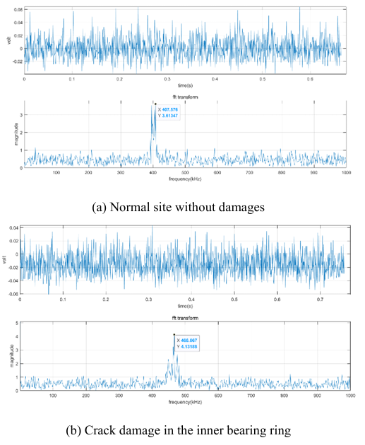 Figure. 3 is the frequency spectrum obtained by FFT transformation of the signal measured by the rotating part involved in the experiment under the condition of rotating speed of 1400 revolutions/min. Figure 3(a) is the shell vibration signal of the fiber grating before the outer ring is damaged, and Figure 3(b) is the vibration signal after the inner ring is damaged. It can be seen that there is a difference in the main vibration frequency. The main vibration frequency of the spectrum obtained by FFT transformation They are 408kHz and 467kHz respectively. After many tests, it can be seen that the fiber grating sensor can correctly detect the existence of defects regardless of whether the crack is located on the surface of the outer ring, or inside the inner ring and rolling body.