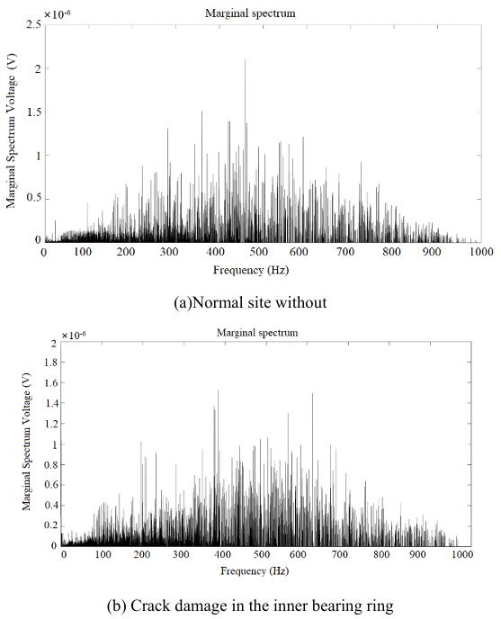 In order to quantitatively analyze the characteristics of elastic wave propagation during the rotational vibration of the rotating body, the marginal spectrum analysis of the fiber grating test signal is carried out. The traditional method is based on the fast Fourier transform (FFT) to obtain the frequency amplitude map. In this experiment, the Hilbert marginal spectrum is used to express the accumulation of the spectral amplitude at each frequency, which can more realistically reflect the frequency components. The amplitude has Additivity. Figure 4 shows the marginal spectral analysis results of the first-order IMF representing high-frequency components after different propagation distances. Under the condition of rotating speed of 1400 r/min, the Hilbert marginal spectral characteristic amplitudes of the vibration signals of the rotating parts before and after the destruction showed obvious differences. As shown in Figure. 4(a), the normal rotating parts show the characteristics of high relative change in amplitude in the low frequency range. While Figure. 4(b) shows the experimental rotating parts subjected to damage and damage treatment, the low frequency range below 200kHZ shows obvious characteristics of low relative change in amplitude, until the amplitude increases rapidly in the range of 200-300kHZ, showing high relative change in amplitude The characteristics of the FFT analysis were verified.