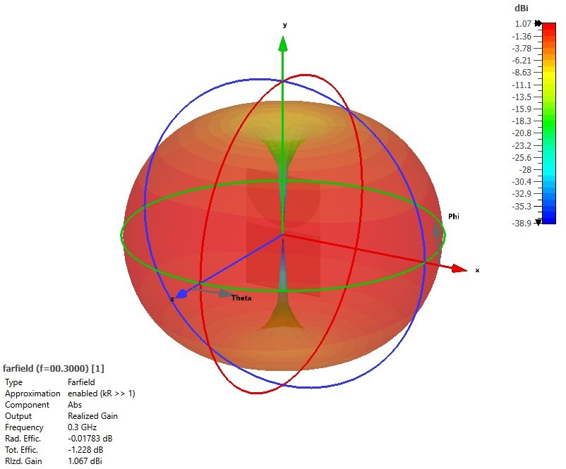 In Figure 6 and Figure 7, 3D realized gain patterns of the proposed monopole antenna with SMA connector at 300 MHz, 500 MHz, 700 MHz, 900 MHz, 1000 MHz, and 1100 MHz are given.