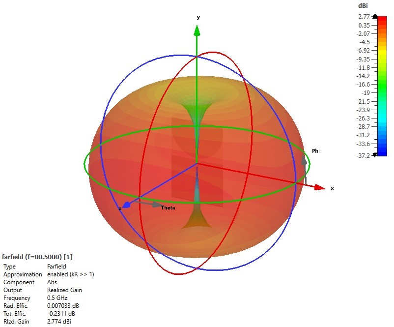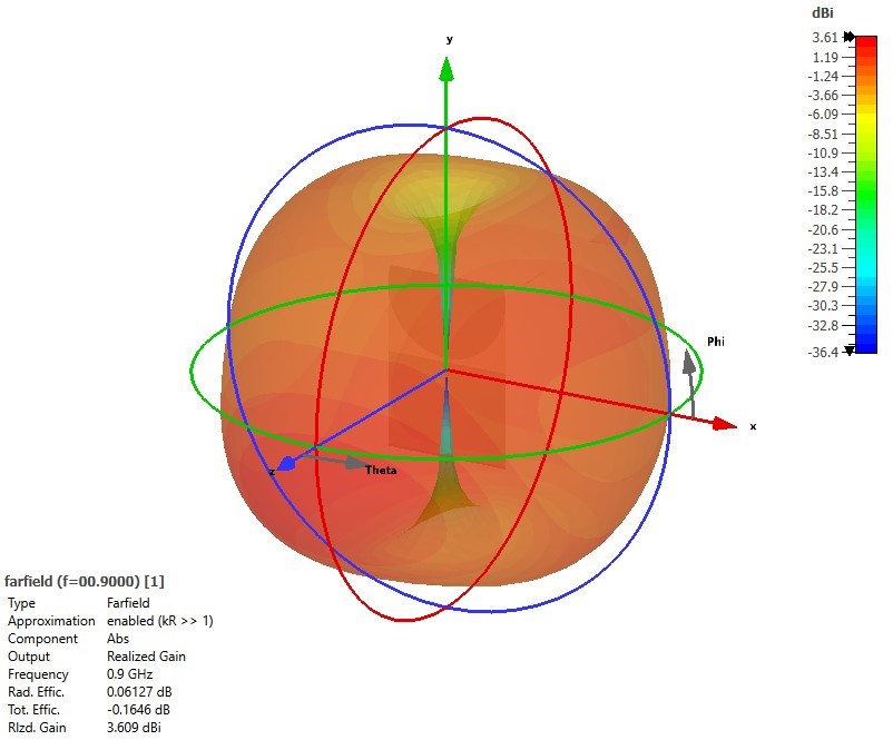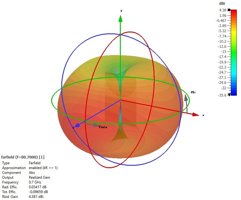 It is seen from Figure 6 that the proposed monopole antenna has an omnidirectional radiation characteristic. Especially up until 700 MHz, the proposed antenna indicates an ideal omnidirectional monopole antenna pattern. It is also seen from Figure 6 and Figure 7 that as the frequency of operation increases, the max gain of the antenna begins to shift towards the upper hemisphere of the 3D realized gain pattern. The tendency of the gain concentrating in the upper hemisphere also seems to affect the lower hemisphere where the null at the center of the lower hemisphere begins to disappear.