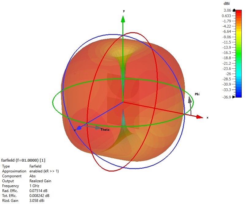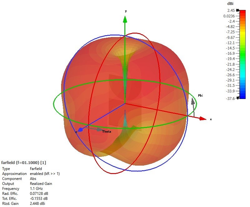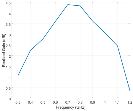 Figure 8 demonstrates the proposed antenna’s realized gain with the SMA connector, along the whole frequency band. Figure 8 shows that realized gain of the proposed antenna is around 1dB at the beginning and end of the frequency band. Max realized gain reaches up to 4.4 dBi at the center of the frequency band. It is also seen from Figure 8 that the antenna’s average realized gain is around 3.05 dBi.