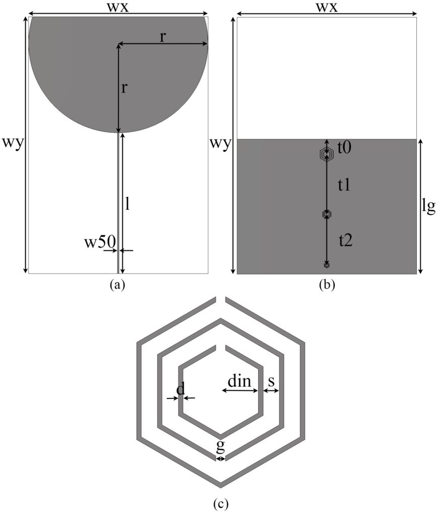 In Figure 1, the proposed antenna’s geometry is presented. The antenna is built on a material whose electrical properties are ϵr = 3.55 and tanδ = 0.0027 while the thickness of the substrate is chosen to be 0.81mm. The proposed antenna comprises of patch radiator that is semi-circularly shaped. Feeding of the patch radiator is realized by a 50-ohm transmission line. The ground plane of the proposed monopole antenna is modified such that three different CSRR structures that are hexagonally equilateral, are inserted onto it. The proposed antenna’s geometry is shown in Figure 1 while the proposed antenna’s dimensions are depicted in Table 1.