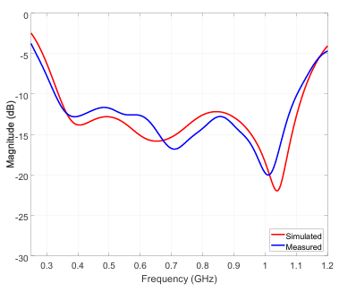 In Figure 10, the front and back view of the manufactured antenna is shown. The return loss of the manufactured monopole antenna is measured with a network analyzer. Figure 11 shows measured and simulated return loss results of the proposed antenna. It is seen from Figure 11 that simulated and measured results agree very well with each other. The frequency bandwidth of the measured monopole antenna is found to be from 320 MHz to 1100 MHz. However, slight differences between simulated and measured results are observed in terms of frequency bandwidth and notch depths. One of the reasons for these differences could be attributed to the environmental reflections. As the frequency of operations decreases, it becomes more challenging to avoid or suppress reflections and interference. Although these reflections have more effect on antenna pattern, they also affect the return loss of the antenna. Another reason for the differences between measured and simulated results would be the manufacturing tolerances.