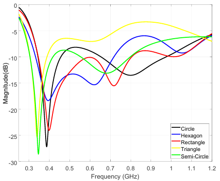 In Figure 2, monopole antennas with different patch radiators’ optimized return loss results are given. It is seen from Figure 2 that the widest S11 bandwidth of -6 dB is achieved by the monopole antenna that has a semi-circular patch radiator. Although the antenna with a semi-circular radiator satisfies VSWR<3 within the frequency range of 300 MHz to 1200MHz, its frequency bandwidth where VSWR<2 i.e. frequency range where S11 is less than -10dB, is divided into two sub-frequency ranges. These frequency ranges are 300 MHz to 420 MHz and 560 MHz – 770 MHz.