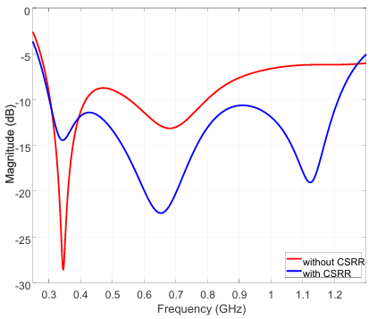 Figure 3 shows the proposed antenna’s return loss results with and without CSRR structures. It is seen from Figure 3 that after insertion of the CSRR structures, broad frequency bandwidth from 300 MHz to 1210 MHz has been achieved.