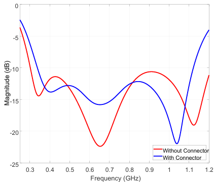 So as to acquire more realistic results, the SMA connector model that is used during measurements is added to the antenna model. In order to avoid any conduction problems, grounding vias has been inserted between the antenna’s ground plane and radiator surface where the center pin of the connector touches the 50-ohm transmission lines. In Figure 4, the proposed antenna’s return loss results without and with the SMA connector are provided. It is seen from Figure 4 that the insertion of the SMA connectors causes the frequency bandwidth of the monopole antenna to decrease by 130 MHz. Moreover, the lack of any unwanted ripples along the frequency band indicates that there is no conduction problem related to the integration of the SMA connector to the antenna model.