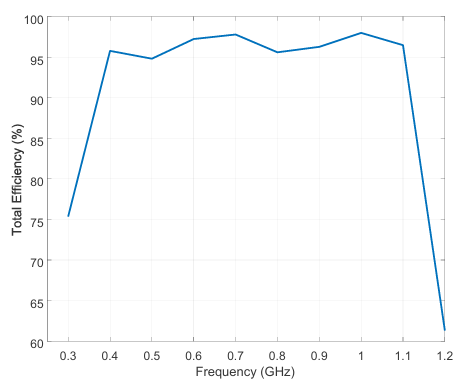 In Figure 9, the proposed antenna’s total percentage efficiency with the SMA connector, along the whole frequency band, is provided. Figure 9 depicts that although the total percentage efficiency at the end and beginning of the frequency band is around 70%, it increases up to 97% at the middle of the frequency band. Moreover, Figure 9 also shows that an average of 94% total efficiency is accomplished within the whole frequency band.