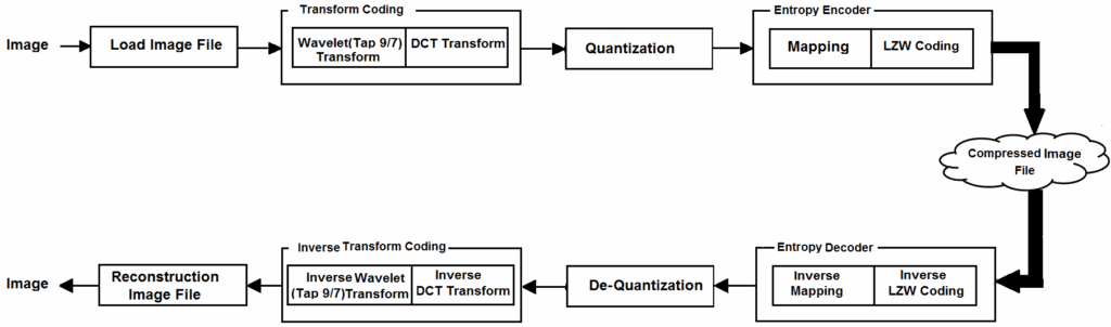 Image compression algorithms have been used with four connected stages in the suggested compression system to produce a high compression ratio with high image quality. A. Load image file, B. Transform Coding, C. Quantization, and D. Entropy Encoder are the steps in this process. To acquire the image data, the load image file is first used. Second, an appropriate transform (DWT and DCT) is done. Thirdly, the results are subjected to a scalar quantization operation to eliminate any psycho-visual redundancies that may still exist. It should be noted that the quantization is performed just once after applying both transforms. After mapping quantization values to positive numbers, LZW coding is used to code the data. Figure 1 indicates the structure of the system model; the following sections go into more depth about each stage of the system.